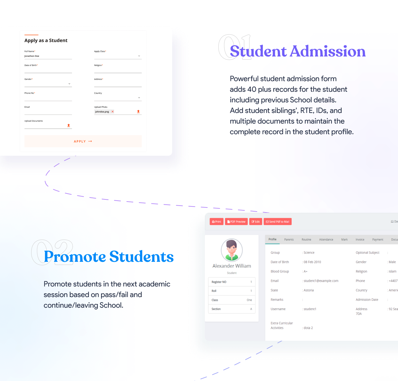 - Digital attendance tracking for students and staff, real-time reporting, and absence alerts to parents.